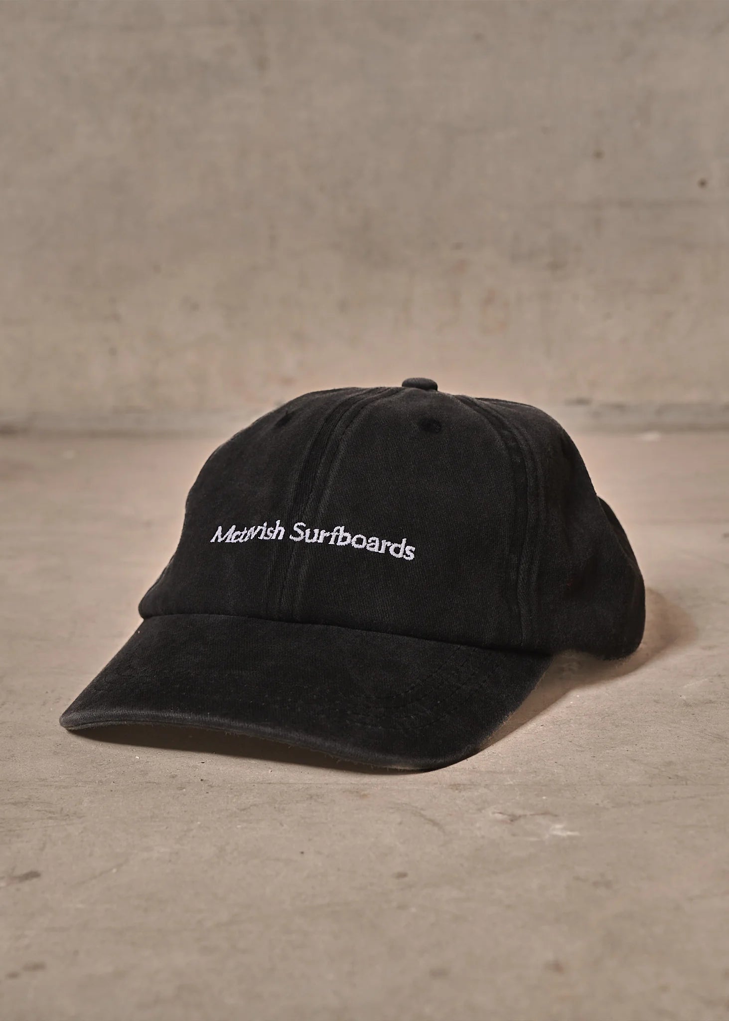 Long peak 6-panel dad cap with seriffed out Mctavish Surfboards embroidery and an acid wash for a slight aged look. Made from organic cotton twill in a washed Black.