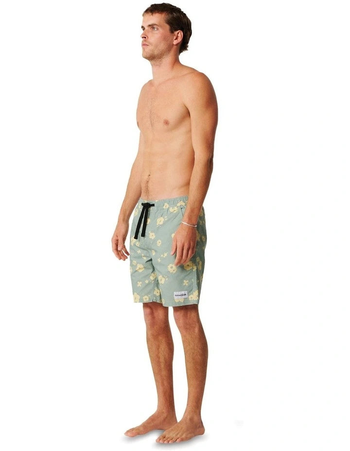 The Splatter Trunk features a 17 outseam, designed to sit just above the knee. Our model is 6'1 is wearing a size 32. It has an elastic waist for a comfortable fit and is made from a stretch poly/cotton fabric. Suitable for use in and out of the water, the fabric dries quickly and wears well.
