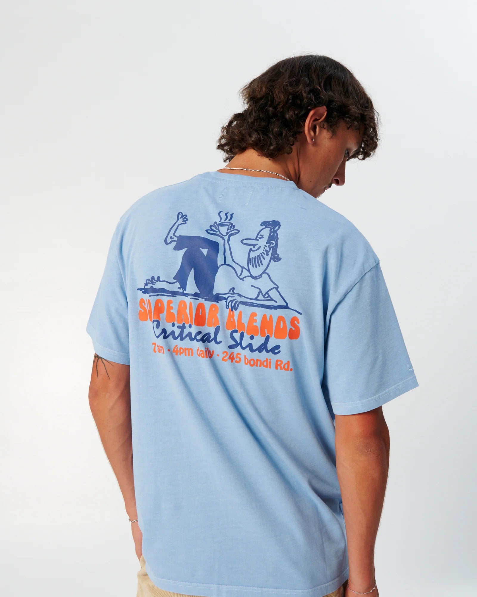 The Blends Tee is cut from our signature 230gsm cotton jersey — a touch heavier than most tees on the market and built to hold its shape. All artwork is created in-house at our Bondi studio. It’s been washed twice to minimise shrinkage and give it that lived-in feel from day one.