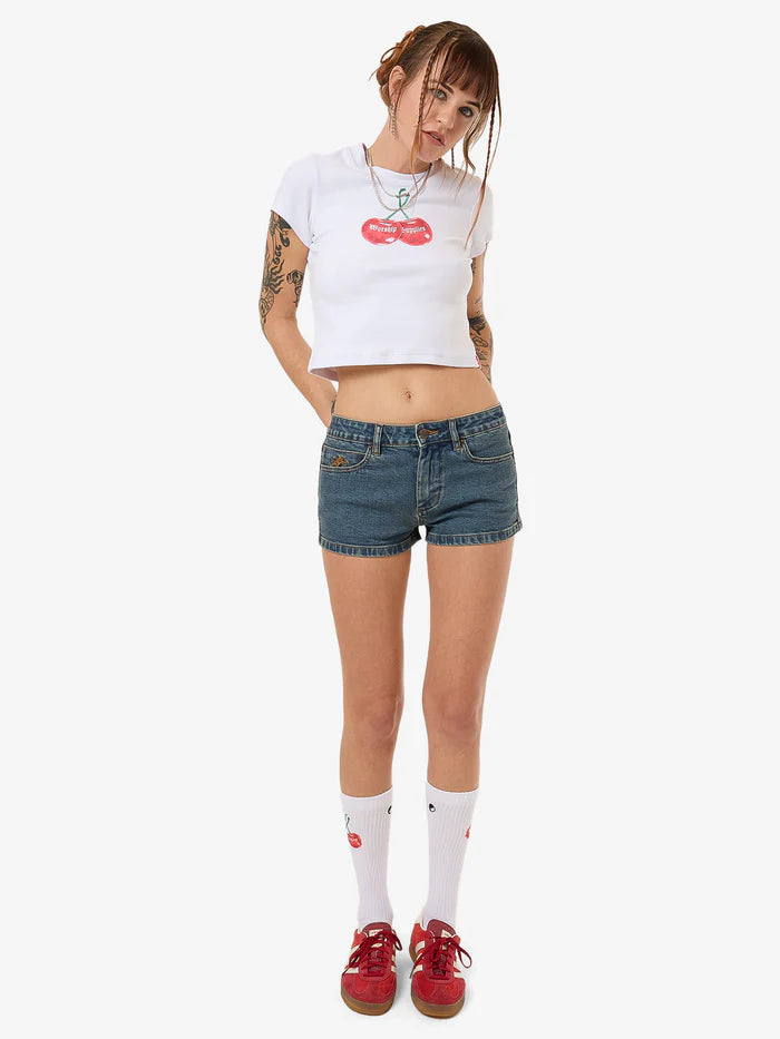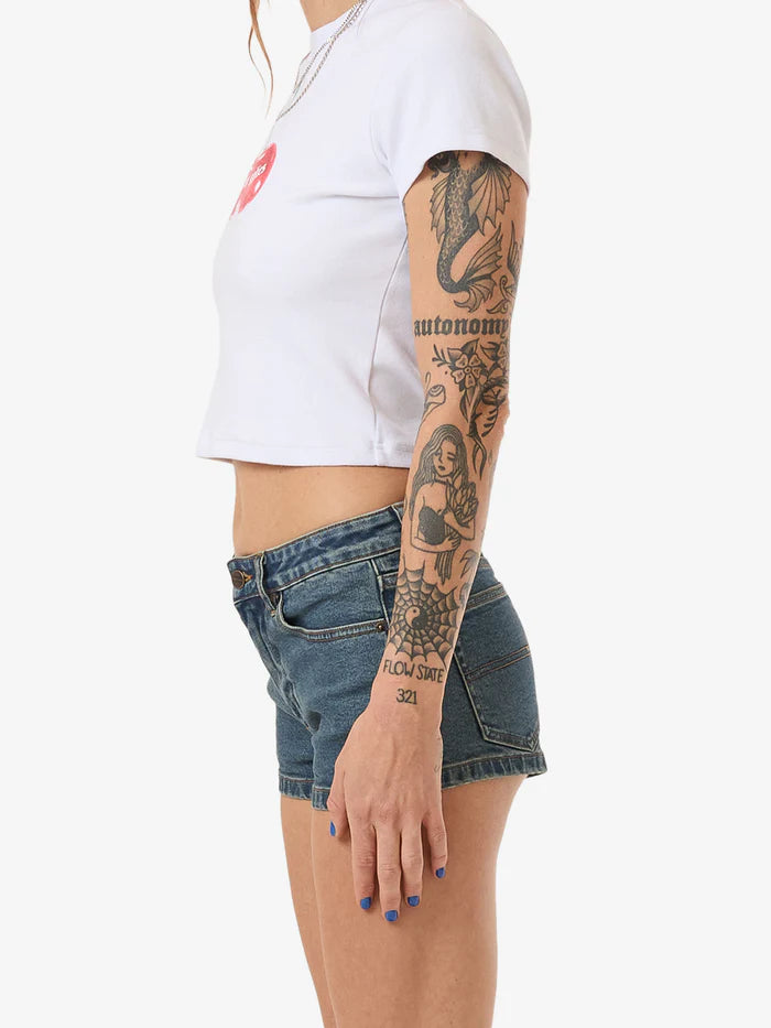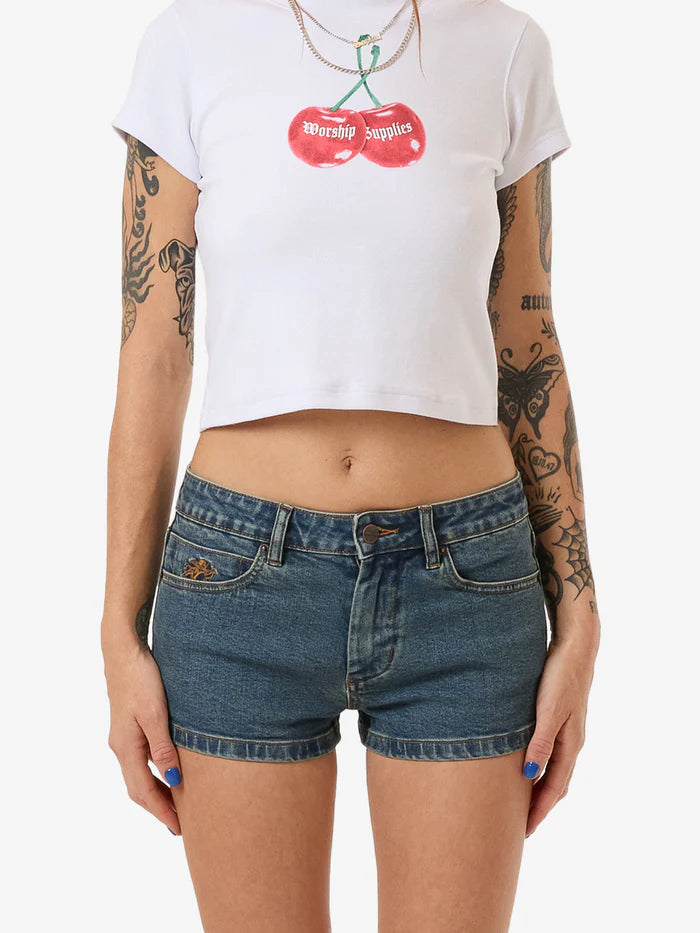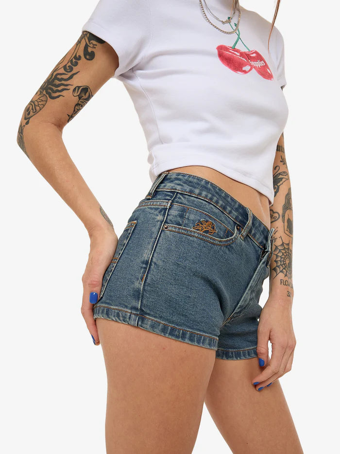 - The Y2K Crush Micro Short is a low-rise, fitted denim short crafted from 99% cotton and 1% elastane. Designed for comfort and durability, it features a stretchy, sturdy denim construction with five-pocket detailing. Available in a vintage style Dirty Mid Blue colourway with slight fading and finished with a sturdy button closure.