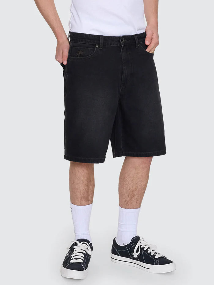 - A warm-weather take on classic workwear, the On Leave Carpenter Jean Short in Raven brings utility and style into everyday street rotation. Cut from durable 13.3oz denim, it features a relaxed, regular fit that sits roomy and comfy through the day. Carpenter detailing and contrast stitching add structure, while pocket embroidery gives it a subtle hit of branding. Finished with a zip and button closure and a washed black tone, these men's carpenter shorts are durable and reliable, ready to pair with tanks to oversized tees and button shirts.